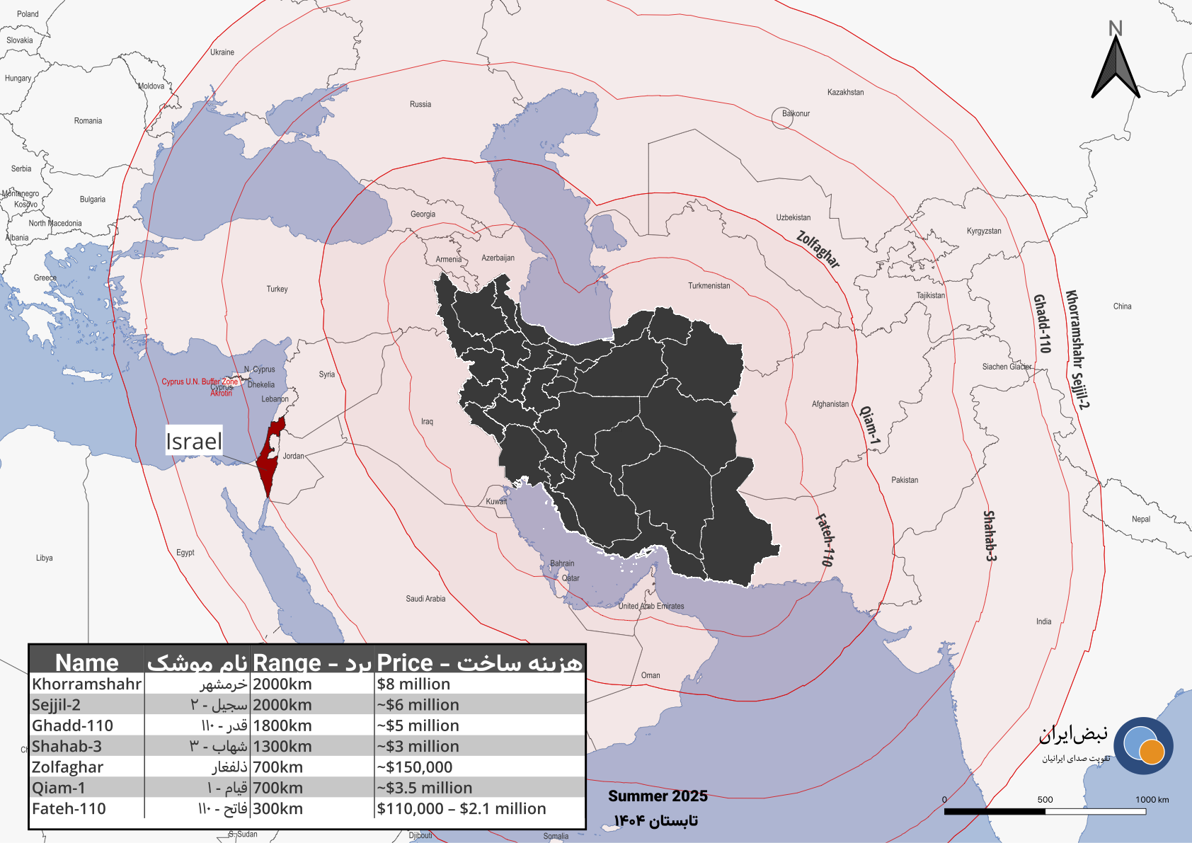سرمایهگذاری چندین میلیارد دلاری ایران در صنایع هستهای و موشکی دوربرد به طور مشخص برای هدف قرار دادن کشور اسرائیل طراحی شده است. نقشه زیر میزان برد و هزینه ساخت موشکهای ایران را نمایش میدهد. باید به خاطر داشت که نگهداری از هر کدام از این موشکها، و سیستمهای پرتاب و هدایت آن هم هزینه هنگفت دیگری را بر دوش دولت میگذارد.