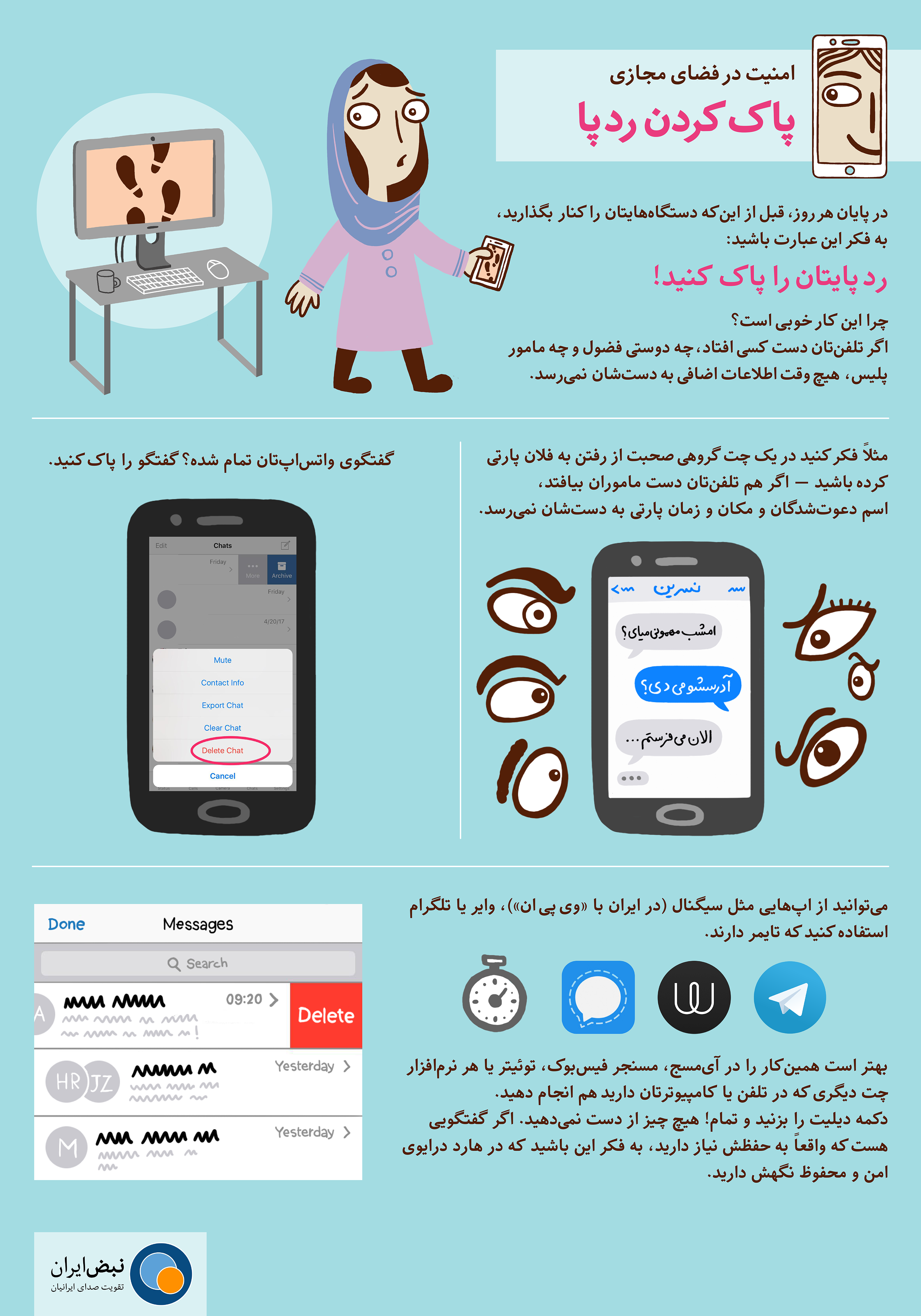 هر کاری که با گوشی موبایل یا کامپیوتر انجام می‌دهید، هر کاری که در محیط اینترنت انجام می‌دهید و هر بار که برای دیگران پیامی می‌فرستید یا دریافت می‌کنید رد پایی از شما بر جا می‌گذارد که دیگران با دنبال کردن آن می‌توانند به شما برسند. چه طور می‌توان تا حد امکان این رد پا را از بین برد؟ داده‌نمای زیر برخی از روش‌های مقابله با این تهدید را شرح می‌دهد.