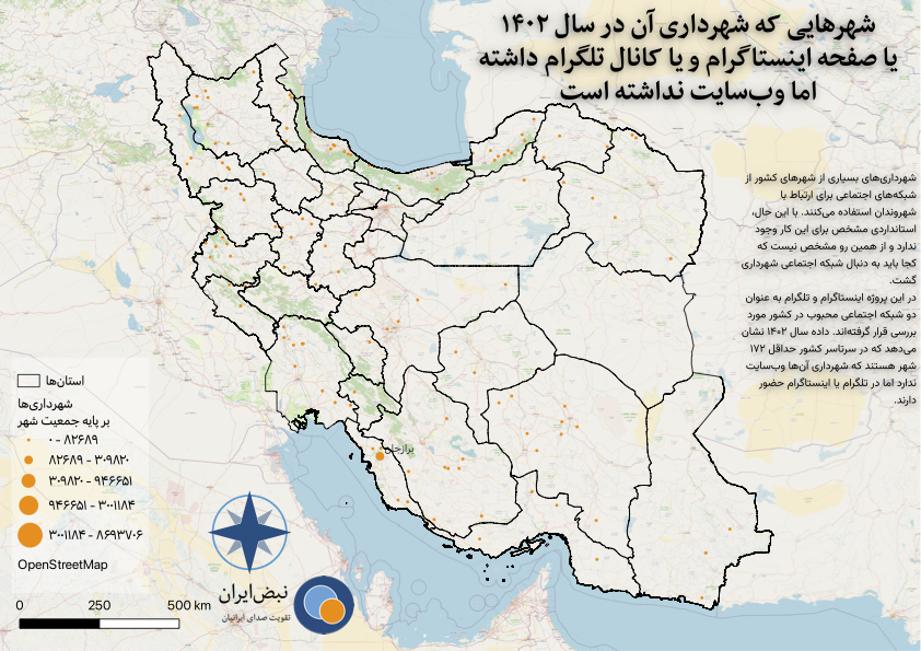 نقشه حاضر نشان می‌دهد که در سال ۱۴۰۲ حداقل ۱۷۲ شهر بوده‌اند که شهرداریشان وب‌سایت نداشته، اما در تلگرام یا اینستاگرام حضور داشته‌اند.