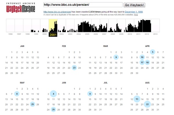 به وبسایت ماشین زمان یا همان Wayback Machine بروید و این نشانی را وارد کنید: http://www.bbc.co.uk/persian آیا میتوانید وب سایت بیبیسی فارسی در تاریخ چهارم ژوئن ۲۰۰۱ را ببینید و دریابید در آن زمان این رسانه به چه شکل بوده است؟ شما برای انتخاب، سال و تاریخ به تقویم احتیاج خواهید داشت.