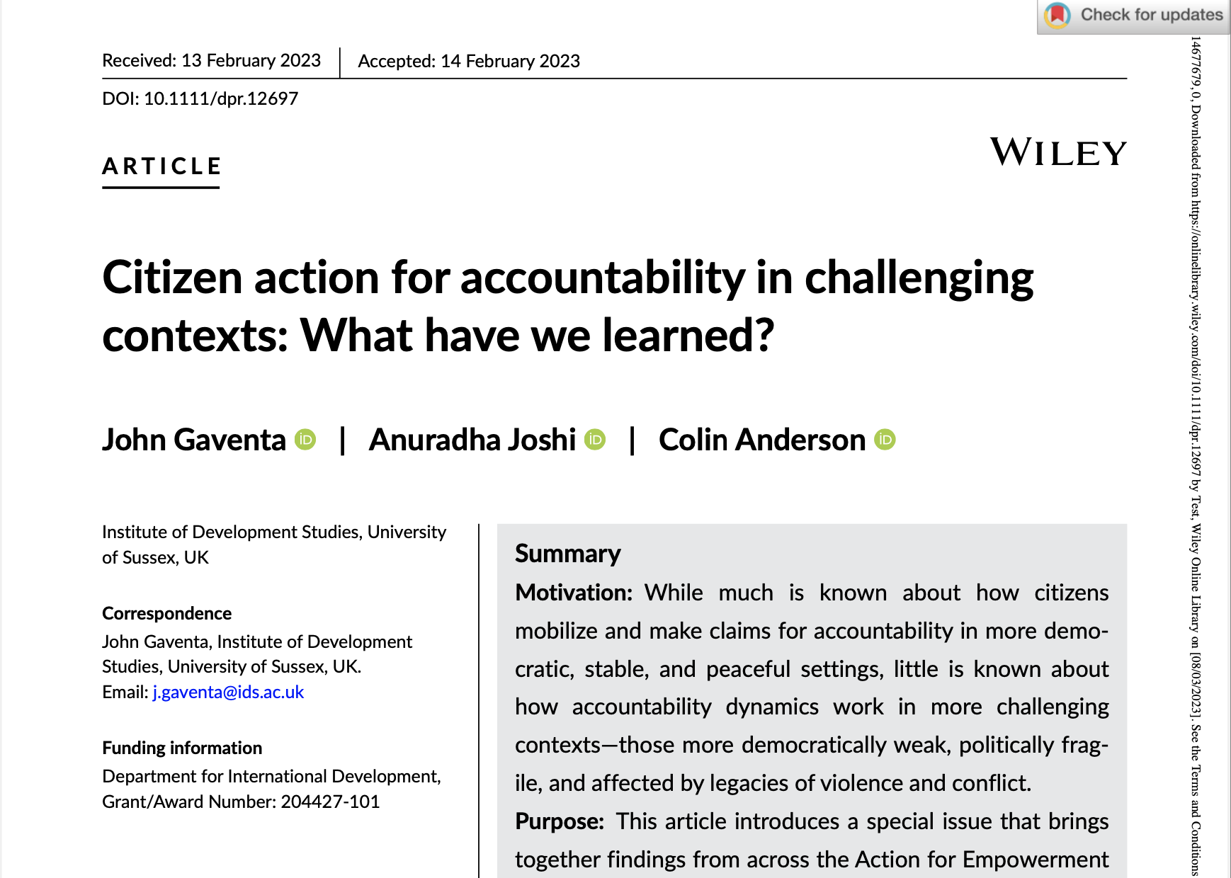 این مطلب که زیر عنوان «از فعالیت شهروندی برای بسط مسئولیت‌پذیری در محیط‌های چالش‌برانگیز چه آموخته‌ایم؟» توسط مؤسسه مطالعات توسعه تهیه شده است، تحقیقات و یافته‌های مربوط به عناصر پیش‌زمینه‌ای، استراتژیها، و پیامدهای کنش اجتماعی و سیاسی به رهبری شهروندان را بررسی می‌کند. درخواست برای مسئولیت‌پذیری بیشتر در همه جای دنیا رو به رشد است. کارزارهای شبکه اجتماعی، گفتمان عمومی، و جنبش‌های شهروندی در حالی به مسئولیت‌پذیری بیشتر فرا می‌خوانند که  اقتدارگرایی در جهان رو به فزونی است.