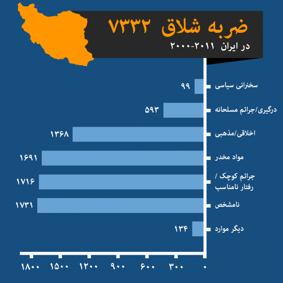 مجازات محتمل برای بیش از ۱۵۰ جرم در ایران میتواند شلاق باشد. مصرف مشروبات الکلی، اختلاط نامحرم در اماکن عمومی از جمله این موارد است. بین سالهای ۲۰۰۰ تا ۲۰۱۱ میلادی در ایران ۷۳۳۲ ضربه شلاق زده شده. دادهنمای زیر جرائمی را نشان میدهد که بیشترین موارد حکم شلاق برای آن صادر شده است.