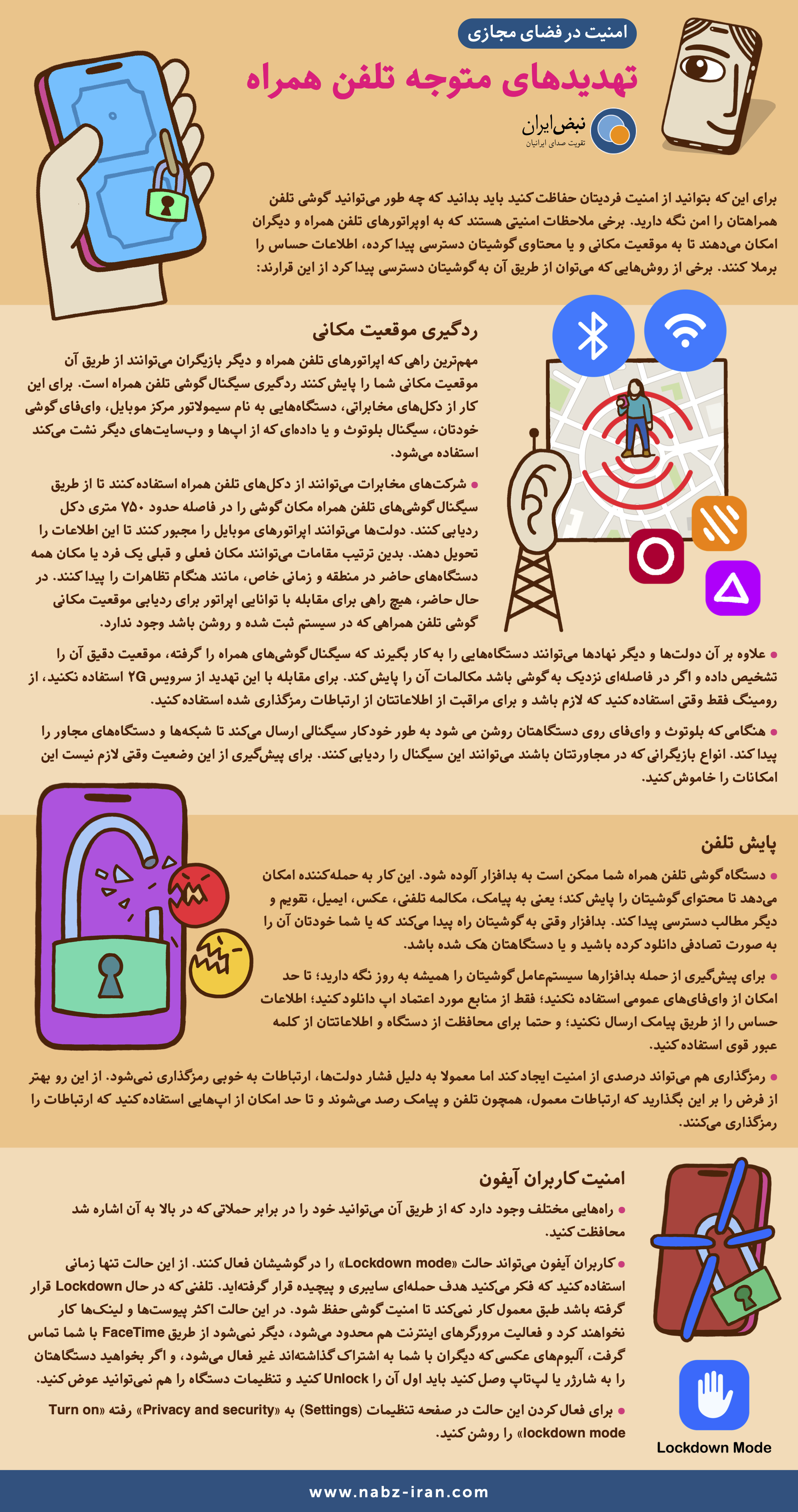 این روزها حجم خیلی زیادی از اطلاعات مربوط به کار و زندگیمان در گوشی تلفن همراه یا همان گوشی موبایل هوشمند همیشه با ما است. این اطلاعات ممکن است شامل عکس و فیلم، مکالمات، فعالیت در شبکه اجتماعی، ایمیل و حتی مکانی که الان در آن هستید شود. همین باعث شده است که گوشیهای تلفن همراه به هدفی محبوب برای خیلیها بدل شود. صاحبان گوشی موبایل باید تهدیدهای امنیتی علیه تلفن همراهشان را خوب بشناسند و برای مقابله با آن اقدام کنند. اینفوگفرافیک زیر شما را بیشتر با چنین تهدیداتی و راههای پیشگیری از آن آشنا میکند.