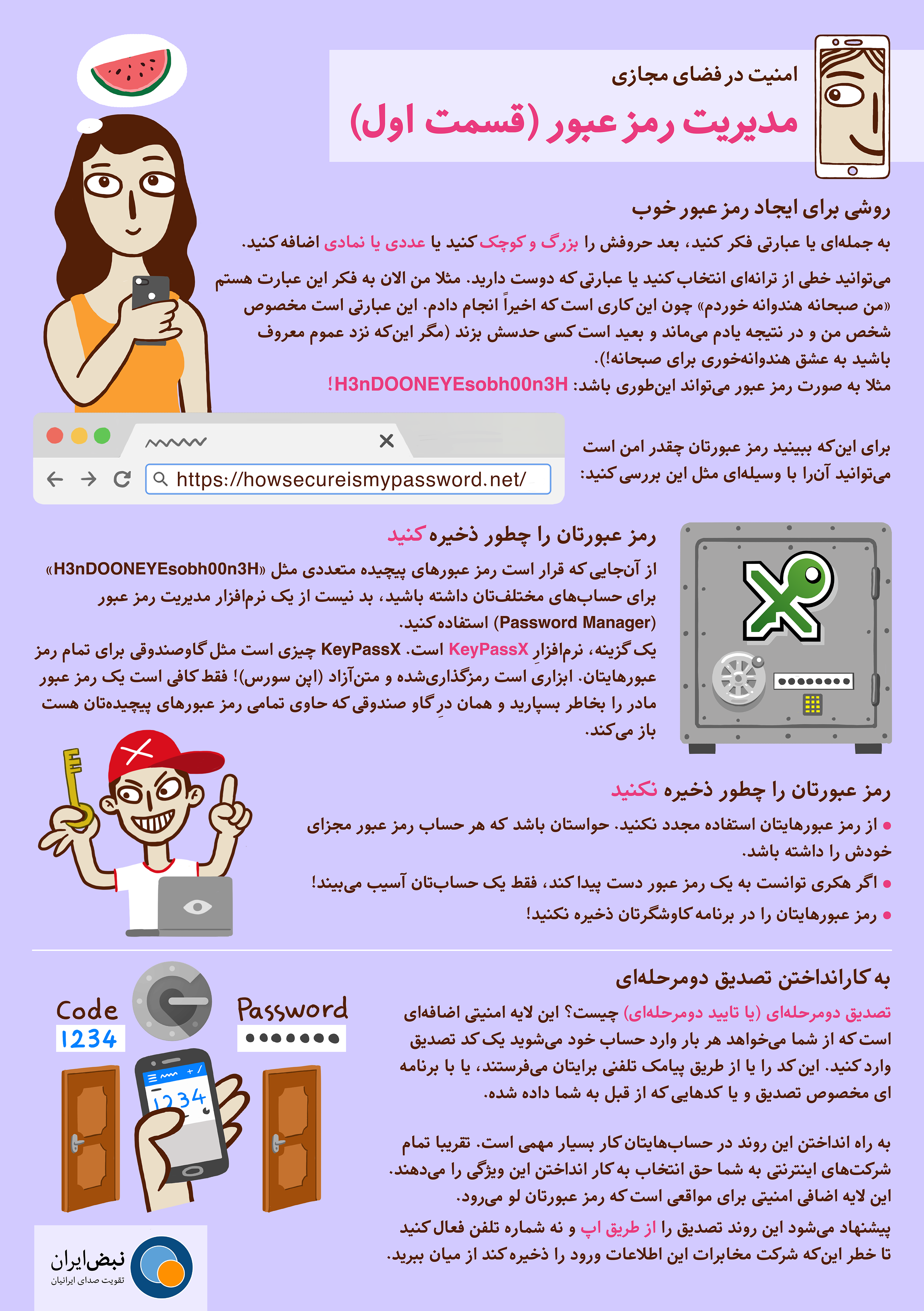 مهمترین ابزار حفاظت از حسابهای کاربری اینترنتی استفاده از کلمه عبور، گذرواژه یا پسورد است. اما پسوردی که استفاده میکنید تا چه حد قوی است؟ آیا برای هر حساب کاربری از کلمه عبوری جداگانه استفاده میکنید؟ پسورد حسابهای کاربرایتان را کجا و چه طور نگهداری میکنید؟ آیا فقط خودتان به آن دسترسی دارید؟ اینفوگرافیک زیر بخش نخست از دو دادهنما پیرامون مسائل مختلف مرتبط به کلمه عبور و نگهداری از آن است.
