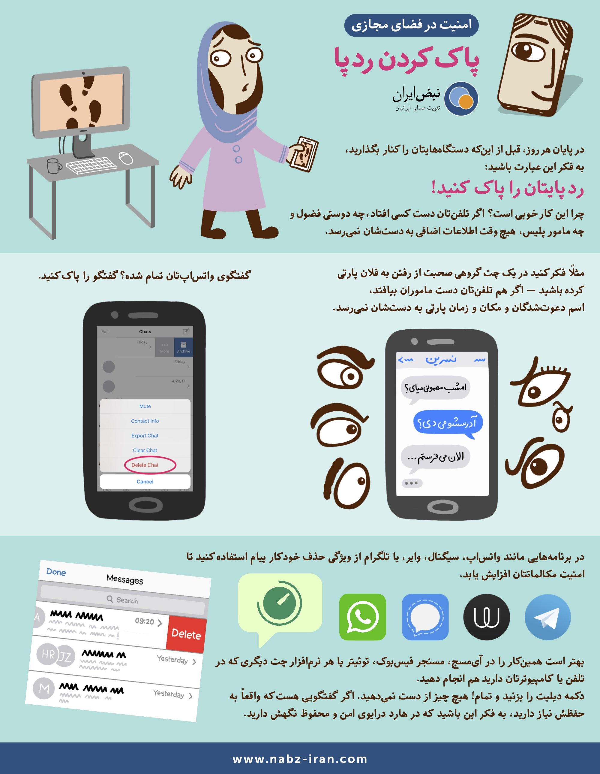 هر کاری که با گوشی موبایل یا کامپیوتر انجام می‌دهید، هر کاری که در محیط اینترنت انجام می‌دهید و هر بار که برای دیگران پیامی می‌فرستید یا دریافت می‌کنید رد پایی از شما بر جا می‌گذارد که دیگران با دنبال کردن آن می‌توانند به شما برسند. چه طور می‌توان تا حد امکان این رد پا را از بین برد؟ داده‌نمای زیر برخی از روش‌های مقابله با این تهدید را شرح می‌دهد.