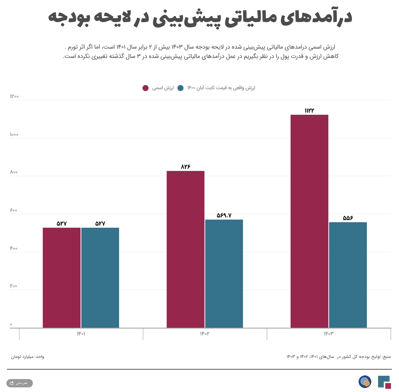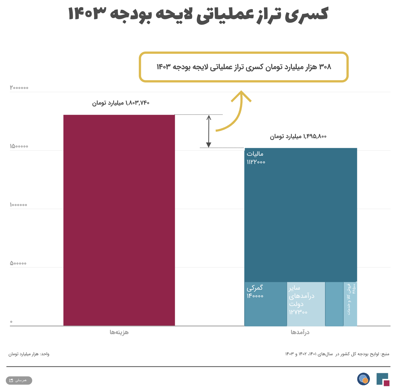 ![]() رشد اسمی و رشد واقعی درآمدهای مالیاتی لایحه ۱۴۰۳ چقدر است؟ | ![]() ۳۰۷ هزار میلیارد تومان کسری بودجه یعنی چه؟ | ||