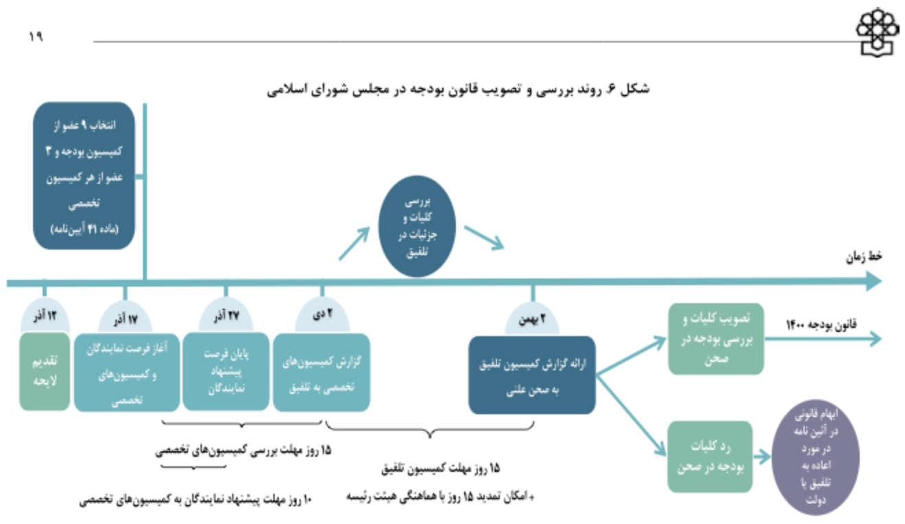 ![]() روند بررسی و تصويب قانون بودجه در مجلس شوراي اسلامی | ![]() برنامه زمان بندی تهيه و تنظيم لايحه بودجه سال ۱۳۹۸ کل كشور |
