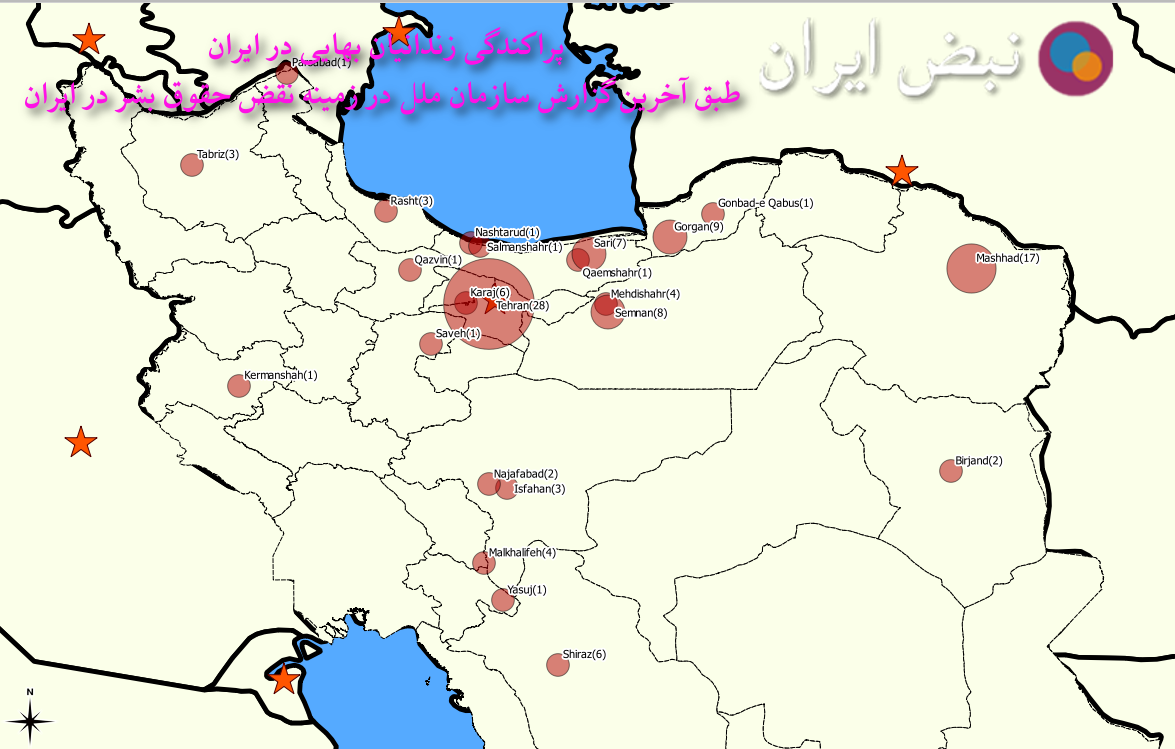 نقشه پراکندگی زندانیان بهائی برپایه آخرین گزارش گزارشگر ویژه سازمان ملل در مورد وضعیت حقوق بشر در ایران