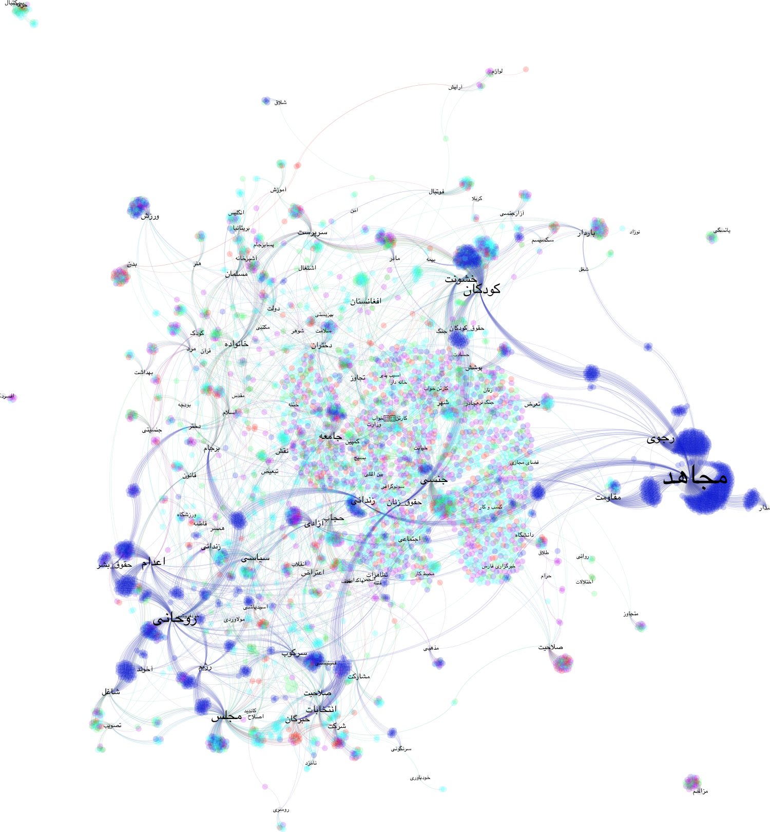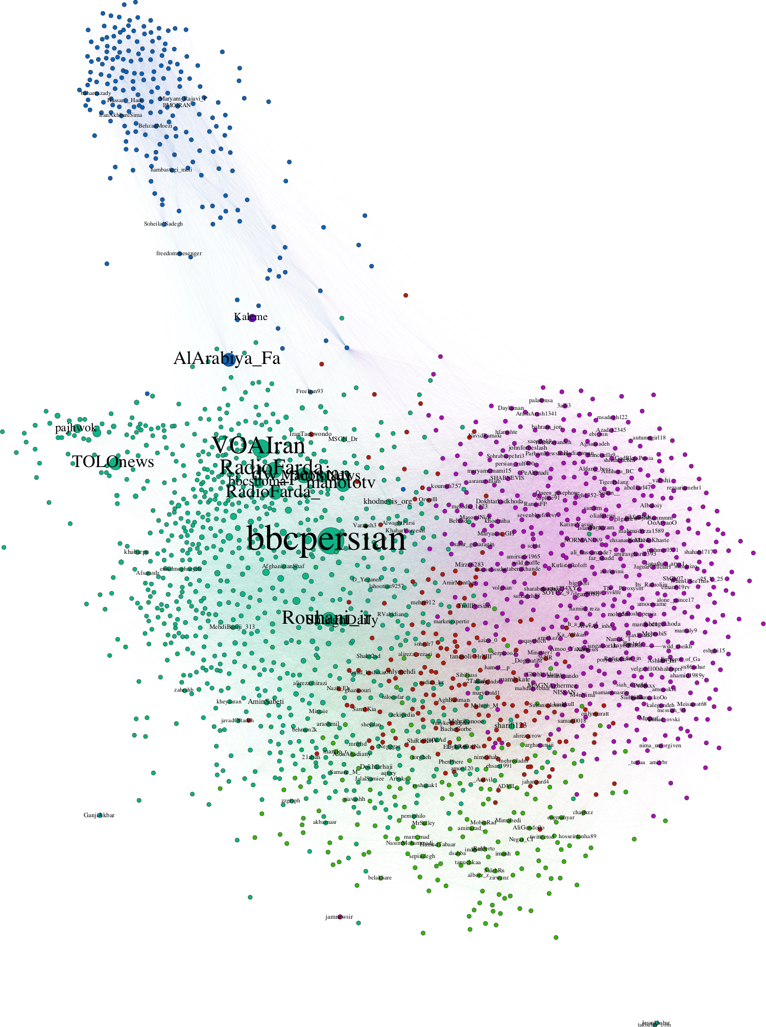 | ۴ | خبرگزاریها، خبرنگاران و سیاستمداران | آبی روشن | ۶۲۲ | ۷۰۵۷ | ۴۱۴ | ۱۶۴۸۸ | ۲۱ | Manototv و BBCShomaو Rouhani_ir |