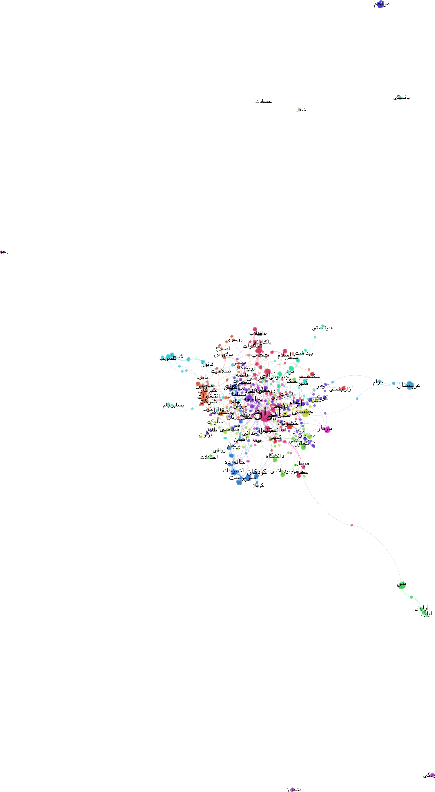 تصویر شماره ۴ - این تصویر اندازه کلمات فراوانی تکرار آنهارا نشان میدهد. نزدیکی و دوری کلمات از هم دیگر نشان میدهد تا چه میزان این واژهها در کنار هم استفاده شدهاند. به این صورت که هرچه اندازه کلمهای بزرگتر باشد، این کلمه در دوره زمانی گردآوری دادهها بیشتر مورد استفاده قرار گرفته. کلماتی که نزدیک به هم دیده میشوند در توئیتها معمولاً با هم استفاده شدهاند. به این ترتیب خوشه کلماتی که با یک رنگ نمایش داده شدهاند مربوط به مقوله یا مبحثی خاص هستند.