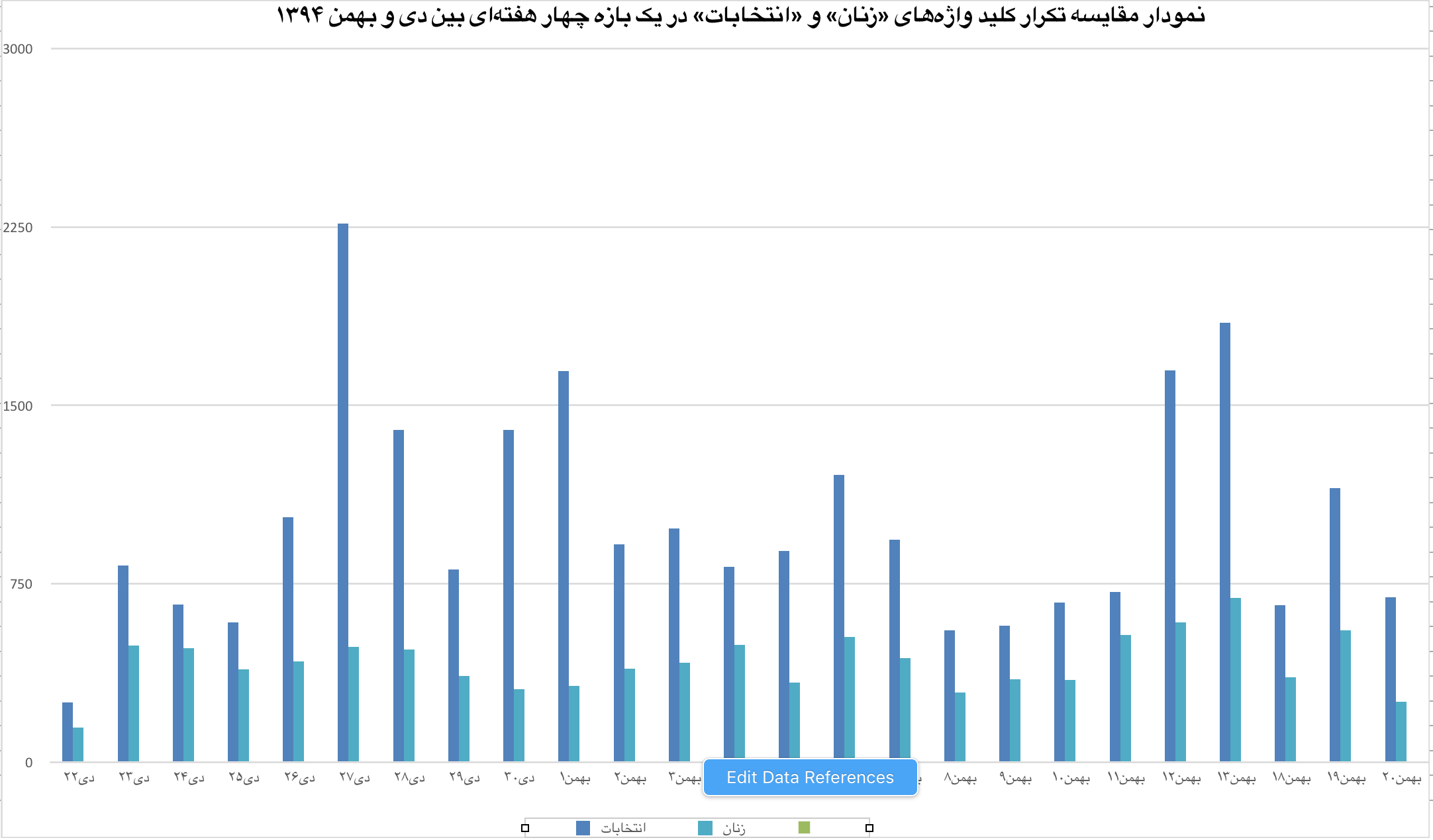 همانطور که در این تصویر دیده میشود توئیتهای مرتبط با انتخابات با توجه به رویدادهای مرتبط با آن نوسان داشته، درحالیکه توئیتهای مربوط به زنان در طول زمان تقریباً ثابت مانده یا نوسان کمی دارند.
