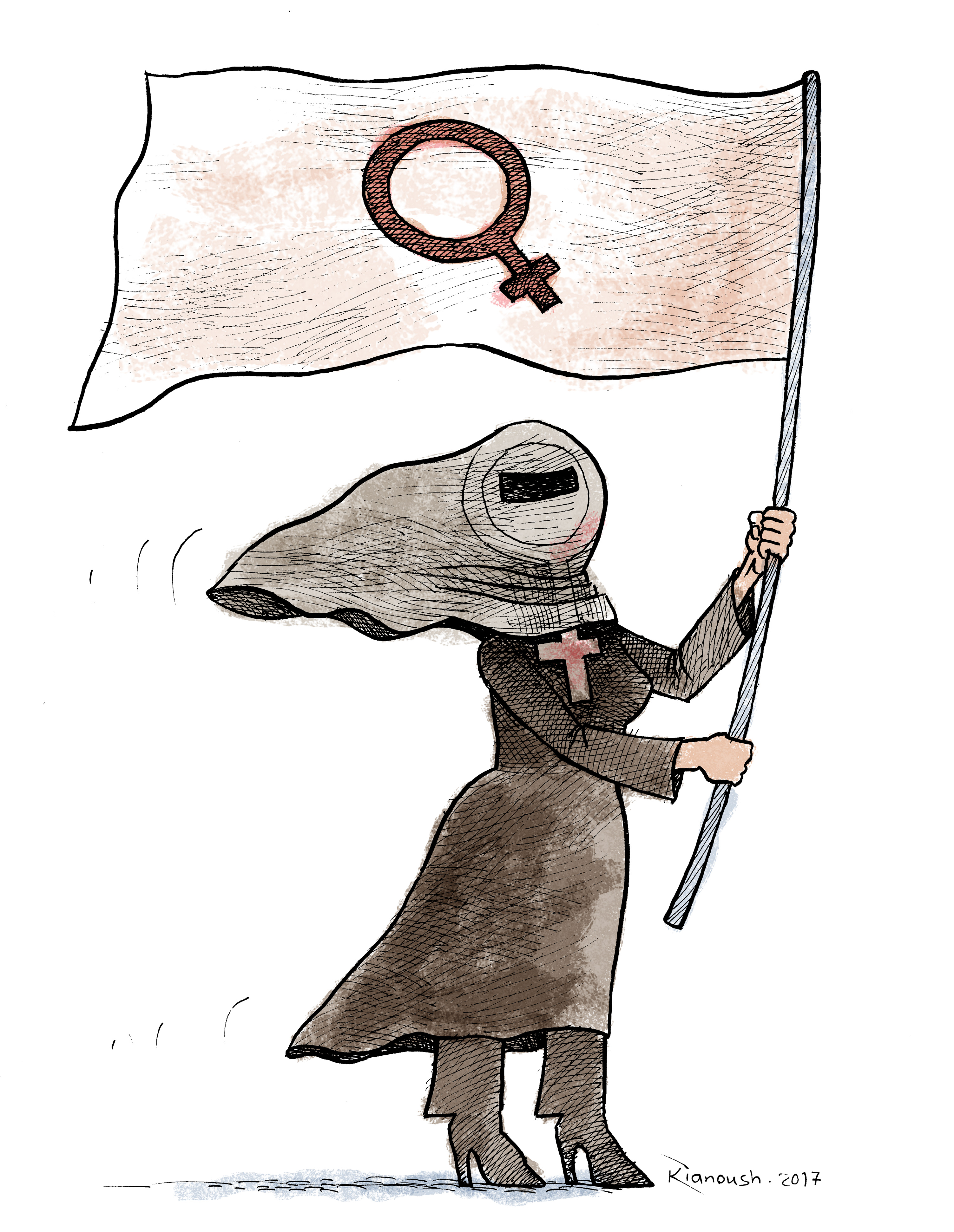 جنبش برابریخواهی زنان در ایران سابقهای طولانی دارد. با این حال زنان در ایران هنوز با چالشهای فراوان اجتماعی، فرهنگی و سیاسی روبرو هستند. کیانوش رمضانی در این کاریکاتور یکی از مهمترین چالشهای پیش روی زنان در ایران را به تصویر کشیده. بیان و ابراز زن بودن. اینکه زنان آنچه را که برایاش به پا خواستهاند، یعنی زن بودنشان را نمیتوانند آزادانه ابراز کنند.