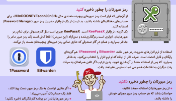 کلمه عبور، پسورد یا گذرواژه مهمترین و معمولترین روش محافظت از حسابهای کاربری در اینترنت است. از همین رو حفاظت از امنیت آن بسیار اهمیت دارد، زیرا اگر کلمه عبور حساب کاربریتان به دست دیگران بیافتد میتوانند از آن علیه شما استفاده کنند. بخش دوم از اینفوگرافیکهای مدیریت کلمه عبور روشهای امنی را بیشتر